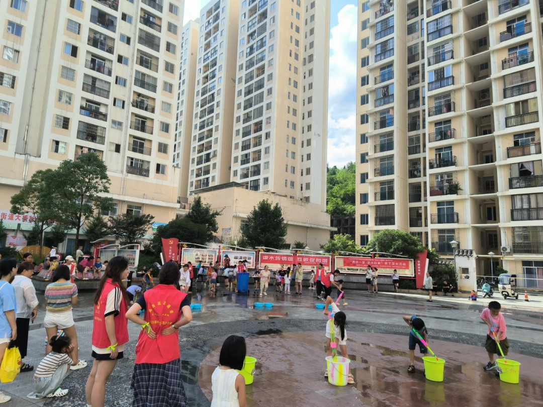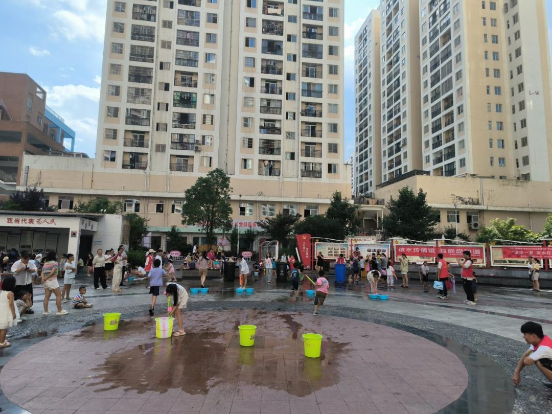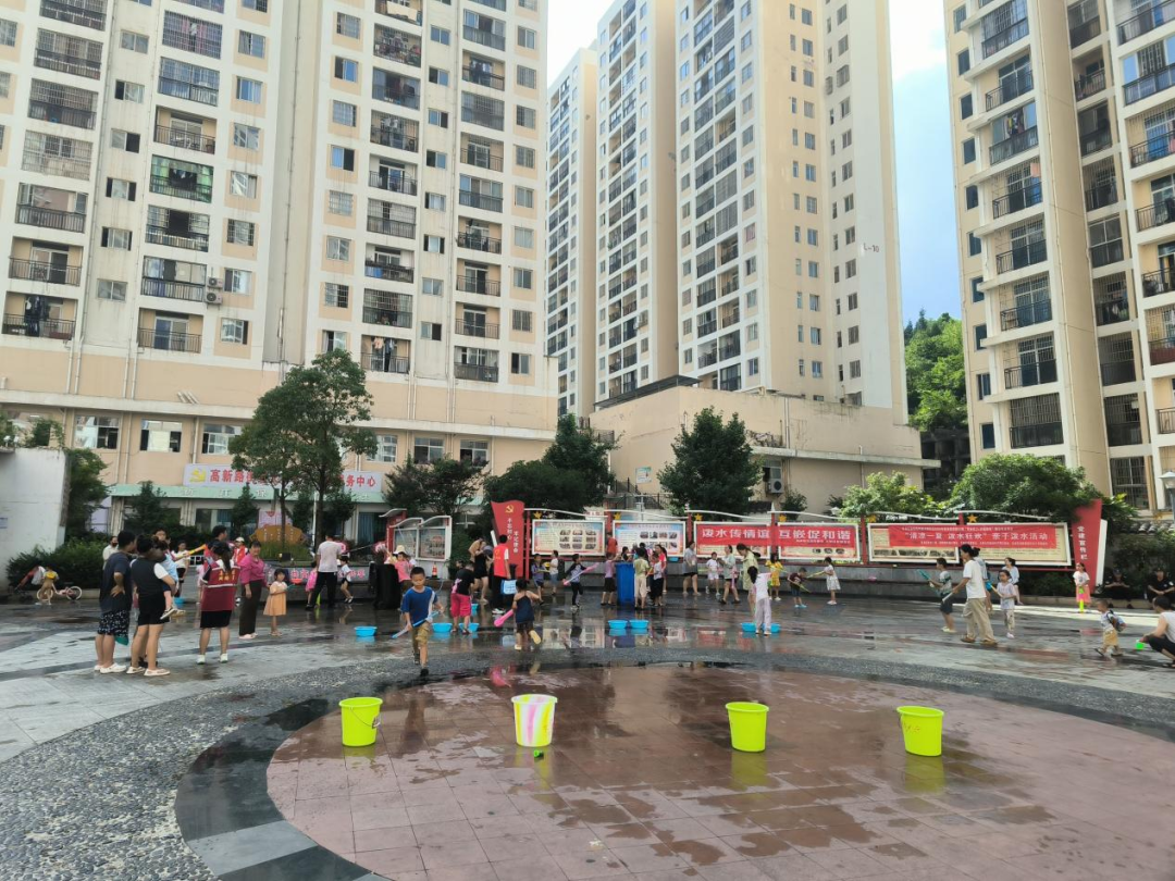 活动现场,社区书记付命琼现场致辞,向居民介绍泼水节的文化内涵,倡导“欢乐泼水、文明互动”,让大家在体验民俗中感受社区温情。活动设置“民俗小课堂”“亲子泼水战”“水枪接力赛”三个环节。民俗小课堂上,社工通过讲解泼水节的由来与寓意,让大家在轻松氛围中了解民族文化。亲子泼水战中,家长与孩子组队,手持水盆、水枪互相“送祝福”,水花飞溅间,欢呼声、笑声此起彼伏,平日里忙碌的家长们放下疲惫,与孩子尽情嬉戏,亲子间的默契在互动中升温。水枪接力赛考验团队协作,每组家庭配合传递“祝福之水”,孩子们加油呐喊,现场气氛热烈。活动中,志愿者们及时清理场地积水,党员志愿者还为参与家庭拍摄合影,记录温馨瞬间。家长们纷纷表示:“这样的活动太有意义了,不仅让孩子体验了民俗,更让我们一家人有了共同的欢乐回忆,感觉社区就像一个大家庭。”